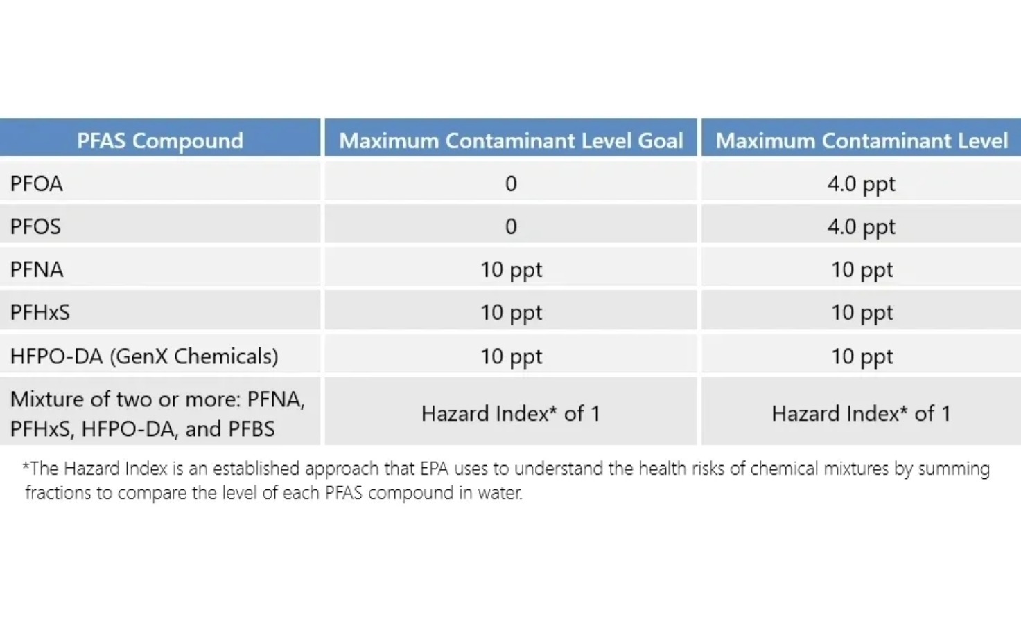 Table 1. New PFAS hazard levels set by EPA in April 2024. The Maximum Contaminant Level is a legally enforceable standard established based on what is feasible using the best-available treatment technology without considering cost. Source: PFAS National Primary Drinking Water Regulation.